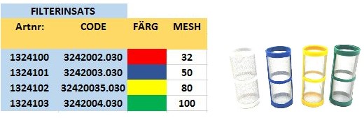 Om filtret inte finns i rätt mesh finns det möjlighet att köpa till filterinsats och byta till önskad mesh 32/50/80 enligt andra tabellen.