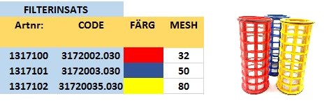 Om filtret inte finns i rätt mesh finns det möjlighet att köpa till filterinsats och byta till önskad mesh 32/50/80 enligt andra tabellen.
